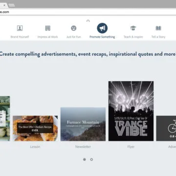 Il login si esegue partendo da un account Facebook, Google o creando un Adobe ID. Al primo passaggio il sistema chiede cosa si vuole creare: un post (post social con grafica come ad esempio meme, citazioni ispiratrici, annunci, inviti), web stories (funziona comoda per fotogiornalismo, riassumere eventi, creare portfolio, cataloghi, ecc.) o video (filmati animati con lezioni, eventi per il lancio di un prodotto, presentazioni, auguri, ecc.). Se non sappiamo bene cosa creare e scegliere è possibile partire da modelli già pronti, preparati e suddivisi per categorie.