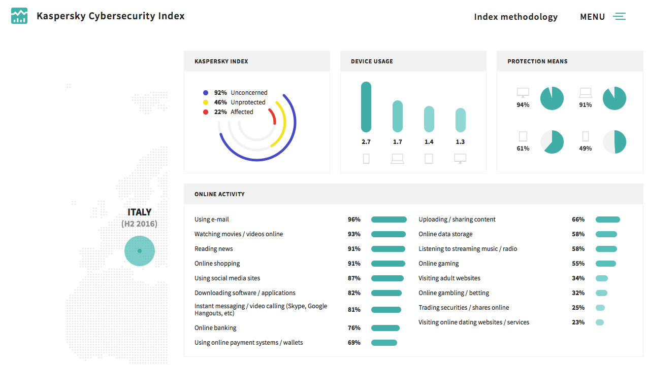 Quasi tutti gli italiani ignorano i pericoli in rete: il 92% degli italiani intervistati ha ammesso di non preoccuparsi delle cyberminacce. Più responsabili invece i cinesi (per lo meno è quello che è risultato dal sondaggio). In Cina, il 72% delle persone possiede soluzioni di sicurezza in tutti i dispositivi connessi. Al contrario, in Svezia solo il 48% degli intervistati utilizza soluzioni di sicurezza in tutti i dispositivi.
