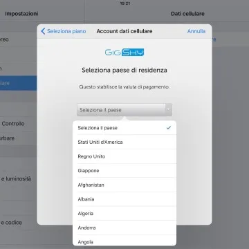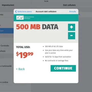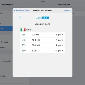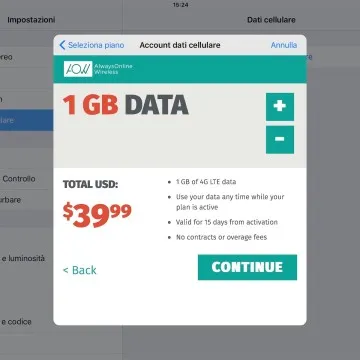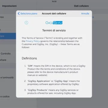 Tenendo presente che la Apple SIM digitale è pensata esclusivamente per l’accesso web all’estero abbiamo modificato Zona e area geografica nelle impostazioni, impostandola su Regno Unito: in un istante la connessione è riuscita, presentando il menu con due operatori mobile virtuali: AlwaysOnline e GigSky. Sono questi gli operatori mobili virtuali che il chip integrato che fa la funzione di SIM, legge e che offrono diversi piani che si adattano alle esigenze di chi viaggia per svago o lavoro, con proposte in base ai MB di traffico dal prezzo abbordabile, oppure in pacchetti per ore, giorni, settimane fino a un mese.