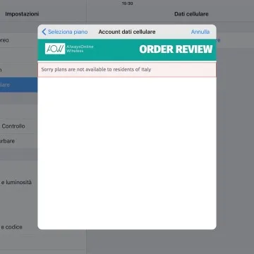 Come ci aspettavamo già all’inizio del test, non è stato possibile completare l’acquisto del pacchetto dati perché il sistema rileva l’indirizzo di fatturazione in Italia della nostra carta di credito: le offerte oggi possibili con Apple SIM digitale sono riservate per chi si trova all’estero. Così i piani prima visualizzati e proposti risultano disponibili solo per turisti e viaggiatori di altre nazioni che si trovano sul territorio italiano.