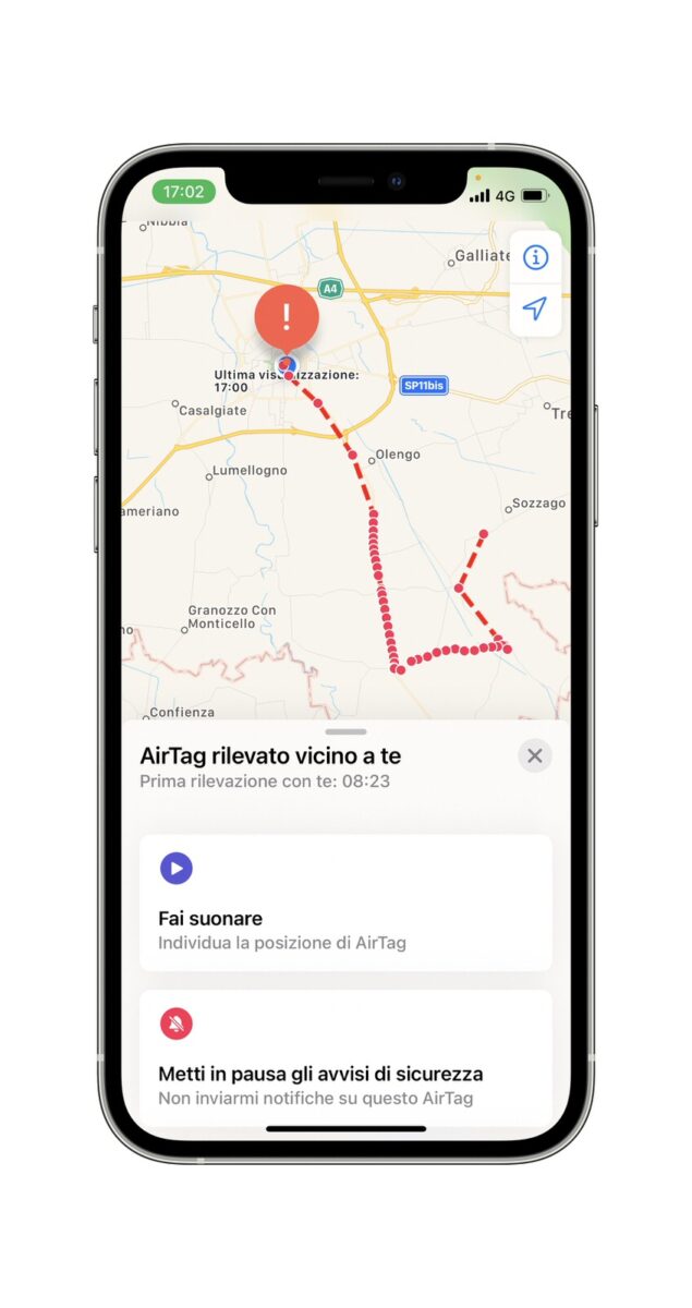 - Se avviso dice che un Airtag sconosciuto viaggia con noi, verifichiamo toccando l’avviso il suo percorso