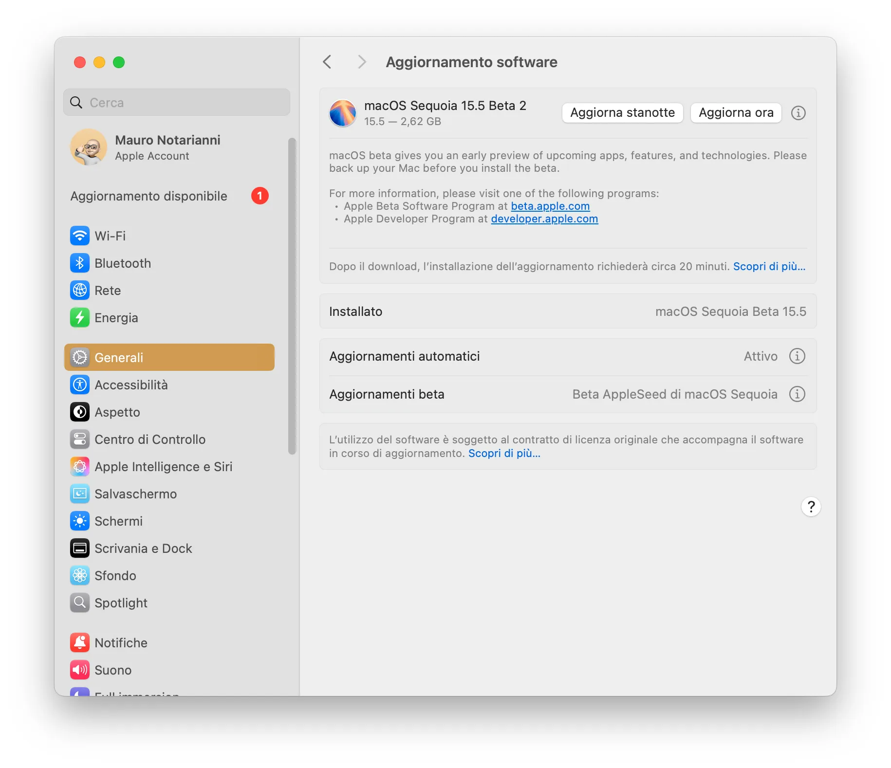 Se sul vostro Mac è già presente l’ultima beta di macOS Sequoia, potete passare alla RC di macOS Sequoia 15.5 aprendo Impostazioni di Sistema > Generali; da questa sezione delle Impostazioni di Sistema bisogna fare click su “Aggiornamenti beta” (in alto a destra), selezionare il ramo dedicato a quest’ultimo update, attendere la ricerca degli aggiornamenti e installare gli update proposti.