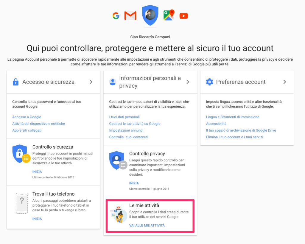 Come detto, Google registra tutte le vostre attività web (come la navigazione, le ricerche sul motore di ricerca, la cronologia delle posizioni, l’uso delle applicazioni e molto altro) e le salva sul suo archivio di informazioni; questo avviene se e solo se siete collegati al vostro account Google, ammesso che ne abbiate uno. In questo caso le informazioni sono salvate e accessibili direttamente da browser. Per verificarle, basta collegarsi alla pagina myaccount.google.com e selezionare l’opzione Le Mie Attività, cliccando su Vai Alle Mie Attività.