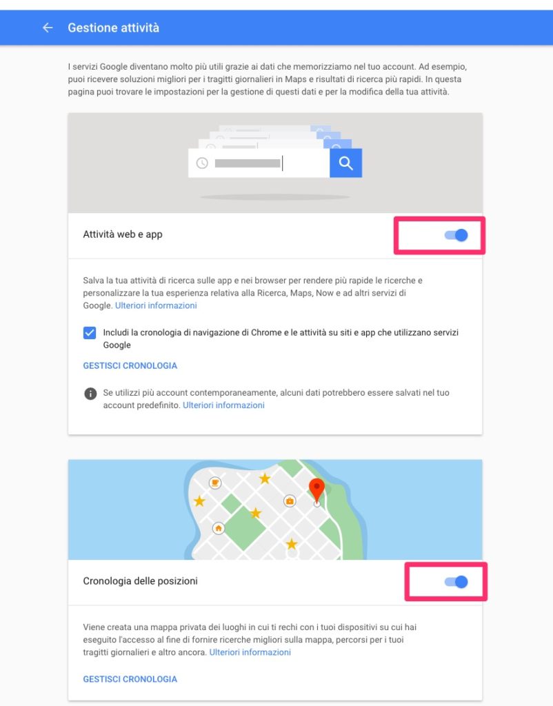 Infine sarà possibile navigare all’interno del menù Gestione Attività (sempre nel menù in alto a sinistra) per esplorare non solo le attività del motore di ricerca, ma anche altre azioni e la loro cronologia, come ad esempio gli spostamenti geolocalizzati o le ricerche vocali.