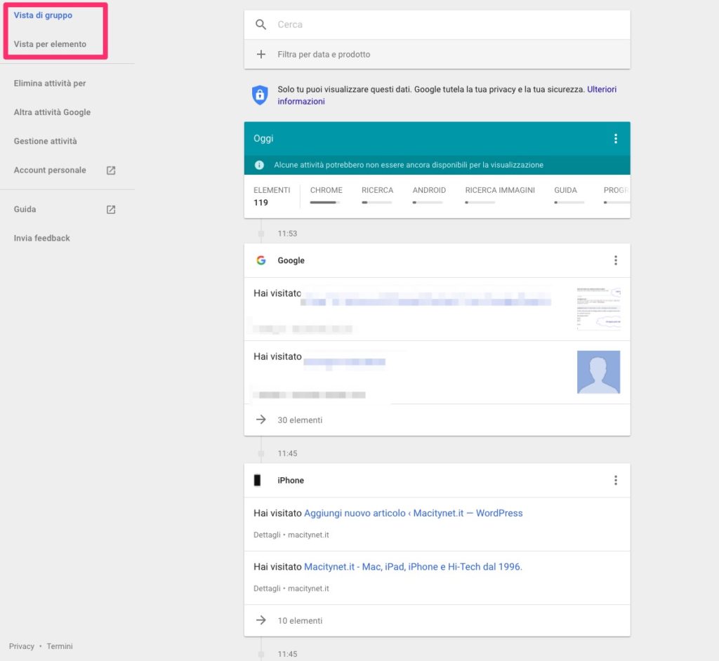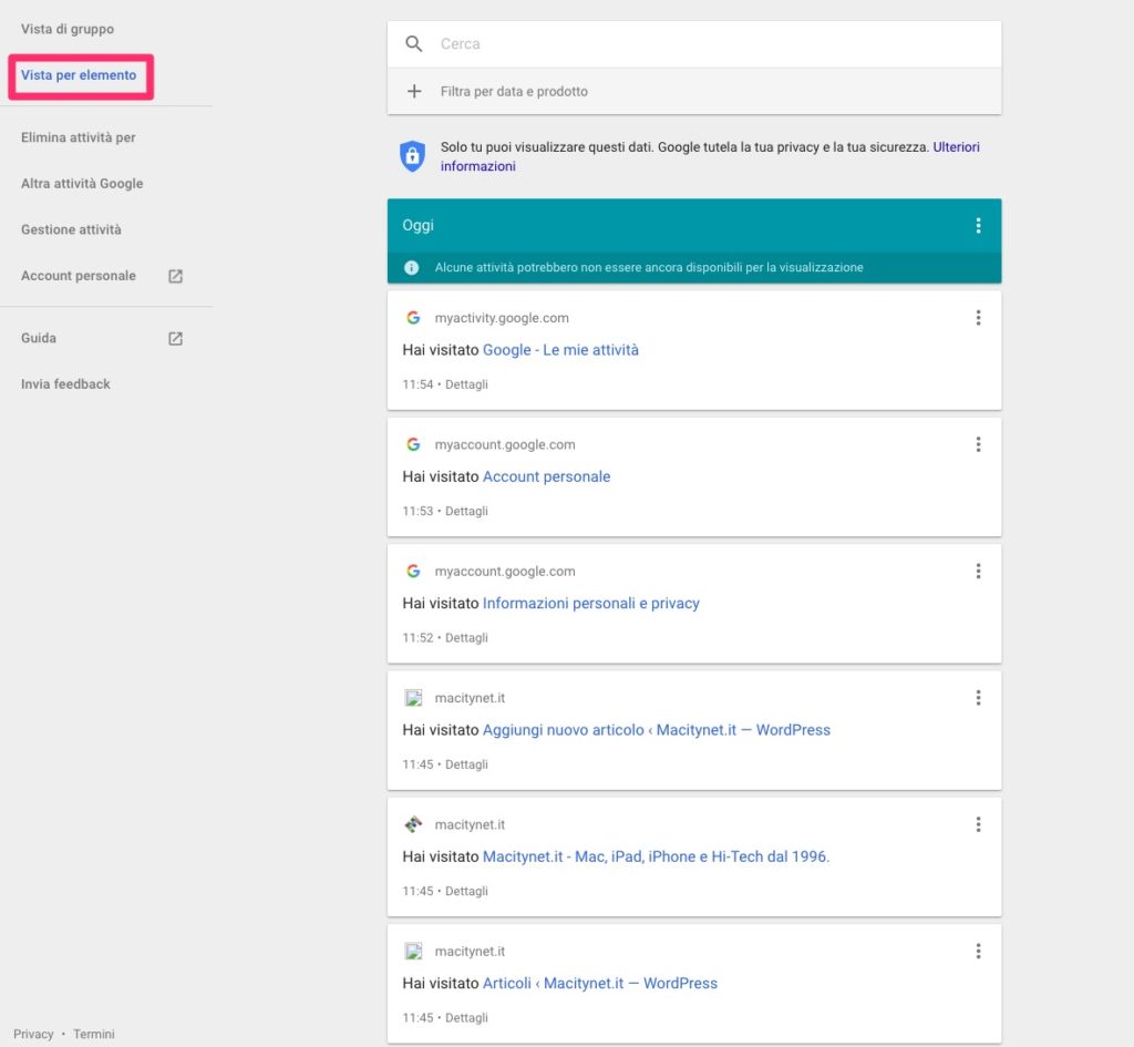 In questa schermata Google mostrerà tutte le vostre attività registrate, l’orario di archiviazione e i dettagli. Con il menù sulla sinistra sarà possibile selezionare come visualizzare le attività, se raggruppate per argomento o tematica (assegnate da Google) oppure come singola attività.