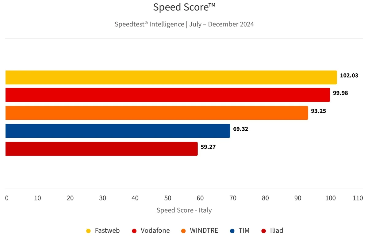 Nella classifica mobile complessiva Fastweb è prima per velocità massima seguita, in ordine decrescente, da Vodafone, WindTre, TIM e iliad. Invece per quanto riguarda le città con le reti mobile più veloci in Italia dopo Bari troviamo Bologna, Milano, Torno, Napoli e Roma.