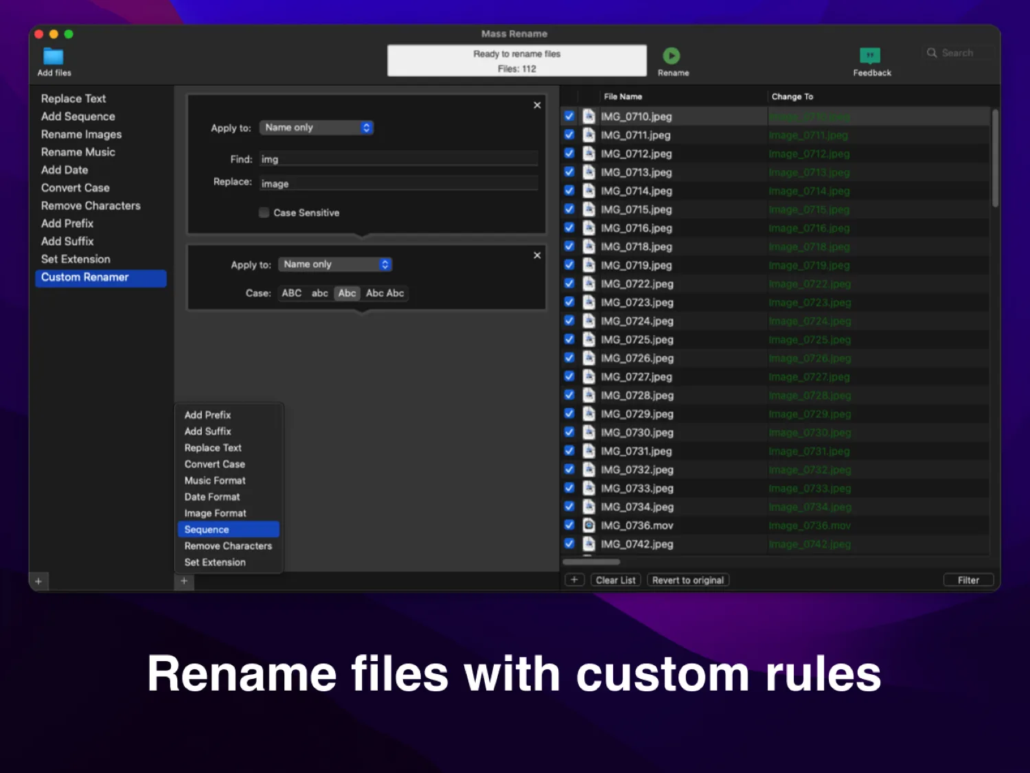 A partire dalle operazioni elencate sopra e combinandole tra loro, l’utente può anche creare sequenze di rinomina personalizzate e complesse, anche in più passaggi. Quali che siano le operazioni da eseguire sui nomi dei file, le sequenze più utilizzate possono essere salvate per poi essere applicate al volo ogni volta che serve con un click.