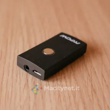 Ha una presa jack da 3,5 mm, compatibile con tutte le cuffie con filo o con il cavetto incluso nella confezione, utile per collegarlo a stereo, autoradio, casse e altri dispositivi dotati di presa Aux. Lungo lo stesso lato trova posto l’ingresso microUSB per la ricarica della batteria interna mentre in uno adiacente fa capolino l’interruttore RX-TX che permette di passare, rispettivamente, alla modalità ricevitore e trasmettitore.