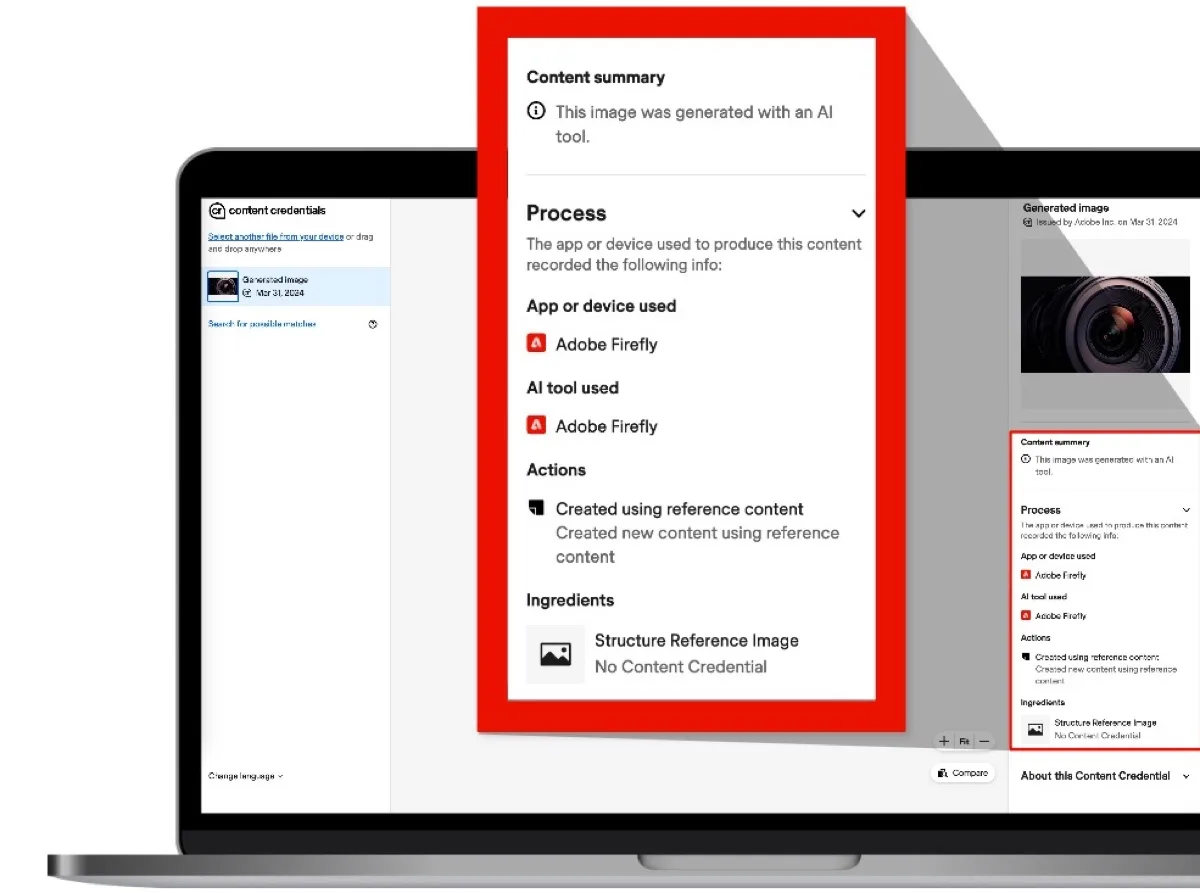 L’etichetta Content Credential viene applicata in automatico a tutte le immagini generate con Firefly AI: le credenziali dei contenuti sono state sviluppate dalla Content Authenticity Initiative guidata da Adobe, che oggi conta oltre 2.500 membri.