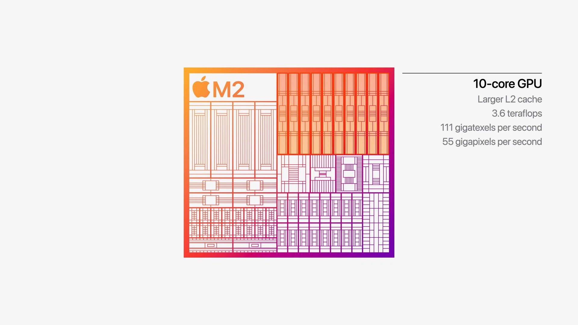 «Rispetto alla grafica integrata del più recente processore per PC portatili – si legge in un documento Apple – la GPU del chip M2 offre performance 2,3 volte superiori a parità di consumi e raggiunge le stesse prestazioni di picco consumando un quinto dell’energia». Secondo alcune informazioni le prestazioni della GPU sono di 3.6 TFLOPS, un teraflop in più dell’8 core dell’M1