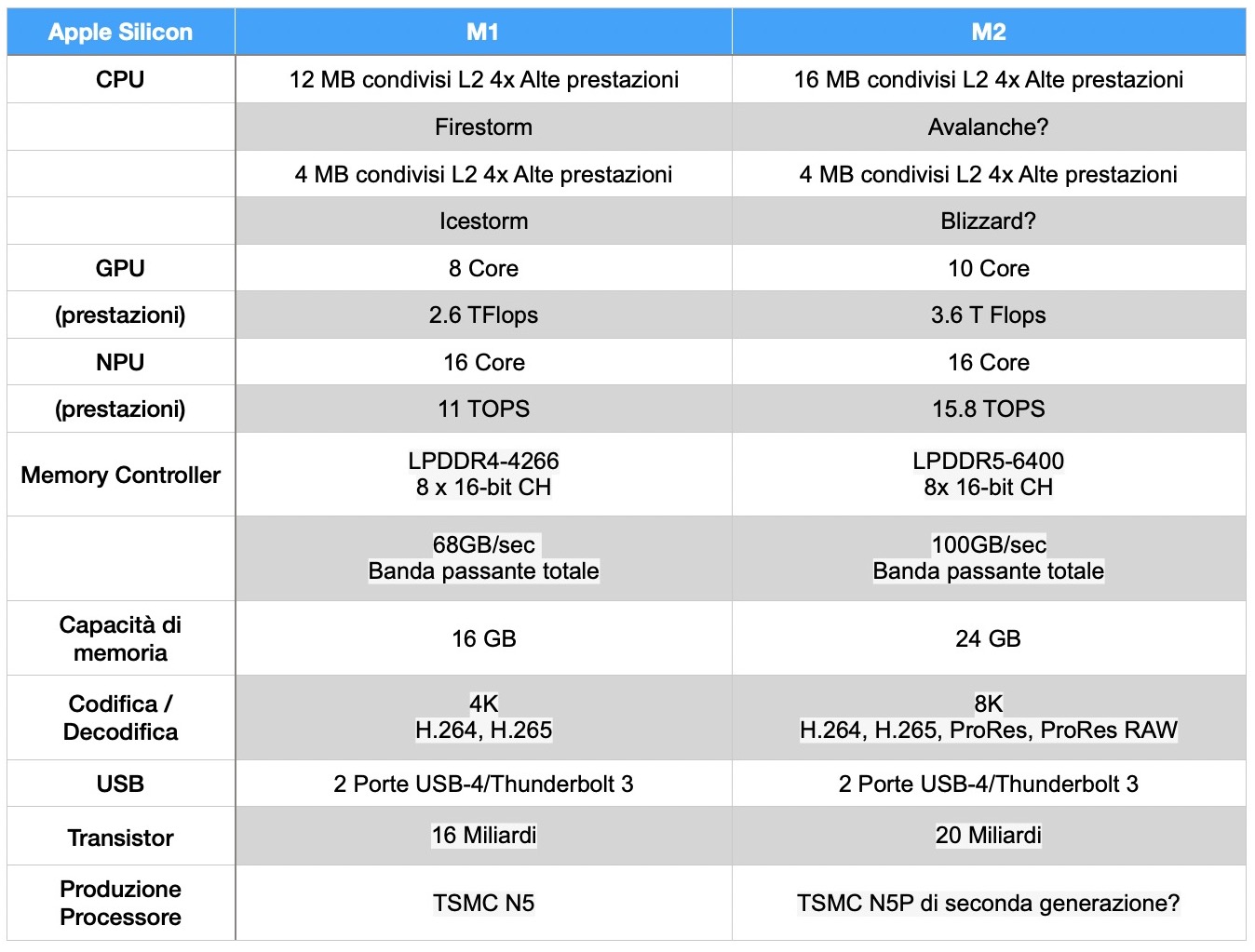 Dalle specifiche tecniche si apprende che il chip M2 si fonda su una circuiteria a 5 nanometri “di seconda generazione” (dice Apple, dovrebbe essere il nodo N5P) grazie alla quale il calcolo viene gestito da 20 miliardi di transistor, il 25% in più di M1. Anche qui sembra esserci una similitudine con A15 che è realizzato su una circuiteria da 5 nanometri di TSMC. I core utilizzati, dovrebbero essere quindi quelli denominati in codice Avalanche e Blizzard introdotti con gli A15.