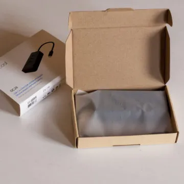 Scatola e forma dell’HUB USB-C sono davvero austeri: in particolare l’HUB è realizzato interamente in plastica nera, ad eccezione della linguetta nelle prese USB di colore azzurro (ad indicare che si tratta di porte USB 3.0).