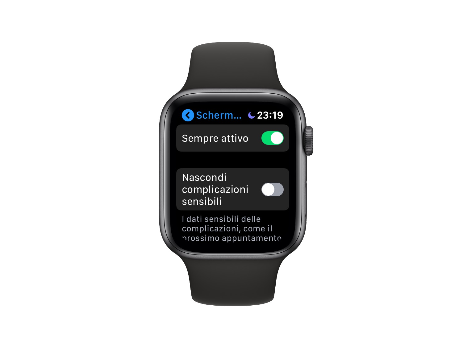 Lo schermo sempre acceso potrebbe essere un problema per la privacy. Le complicazioni forniscono informazioni anche personali: appuntamenti, nomi di chi telefona, tracce musicali, titoli delle email, intestazioni di messaggi. Apple ci ha ovviamente pensato e vi permette di selezionare una modalità: “Nascondi complicazioni sensibili”. Queste informazioni vengono sfocate e non sono leggibili a meno che non giriate Apple Watch 5 verso il vostro volto per leggerle; il calendario ha solo la scritta “calendario”. Quando arriva una chiamata o un messaggio, Apple Watch vibra oppure suona, a seconda di come avete regolato le preferenze, ma sullo schermo non appaiono informazioni specifiche.