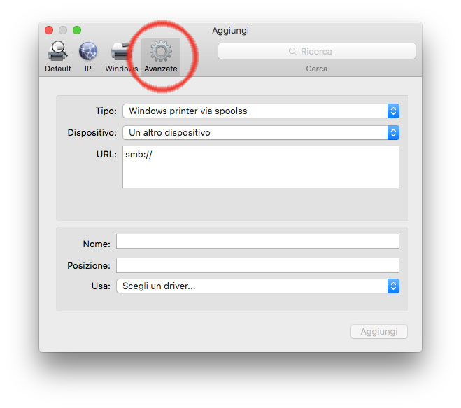 Windows: scegliamo “Windows” se la stampante è connessa a un PC tramite Condivisione stampante o se è connessa alla rete tramite il protocollo SMB/CIFS di Windows. Potrebbe essere necessario attivare la voce “Condivisione file” (nelle Preferenze Condivisone) per la connessione alle risorse di Windows in rete.