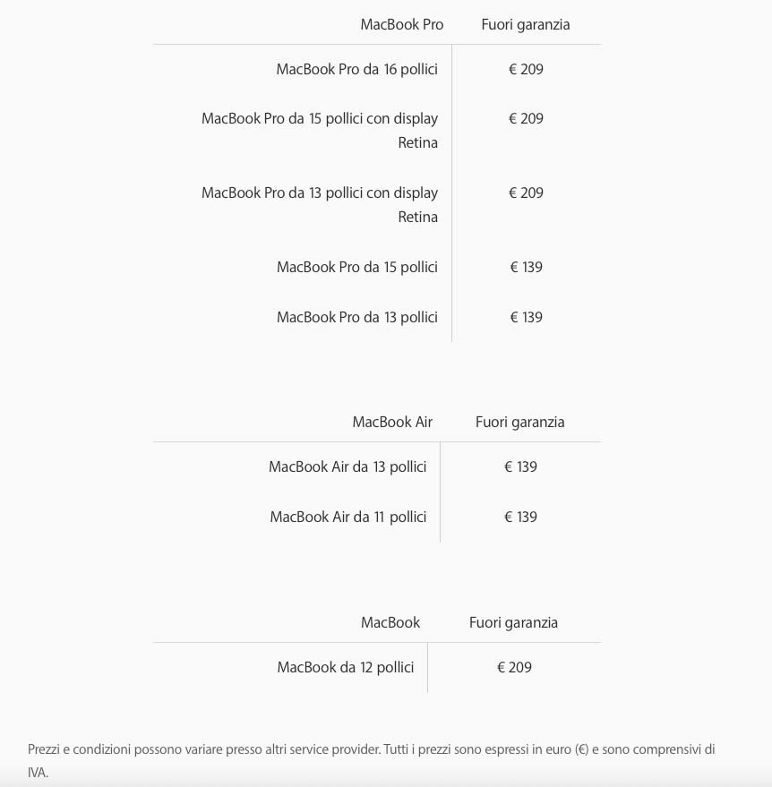 Il costo di sostituzione batteria dipende da vari fattori. Se lo facciamo da soli, senza rivolgerci ad un centro di assistenza autorizzato, è ovviamente possibile risparmiare qualcosa. Non fatelo ad ogni modo se non siete pratici con lo cacciaviti e nello smontaggio di dispositivi. Tenete inoltre conto ad ogni modo batterie originali e batteria compatibili che si trovano su vari negozi online, incluso Amazon, alcune delle quali arrivano con tanto di cacciaviti necessari per portare a termine l’operazione. Non sempre la qualità della batteria compatibil quest’ultime è elevata e se volete la sicurezza è meglio affidarsi a batteria originali o di marchi noti). Apple ha un listino ufficiale e di seguito trovate i prezzi per l’assistenza della batteria nel momento in cui scriviamo.