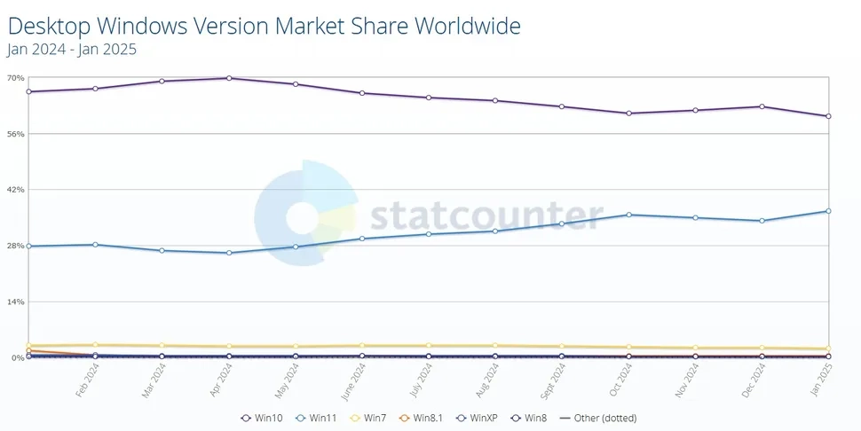 Secondo dati di StatCounter, Windows 11 ha pian piano guadagnato quote di mercato e a gennaio 2025 vantava il 36,65% di market share globale dei sistemi operativi, una crescita lenta ma stabile, complice anche la già citata data della fine del supporto per Windows 10.
