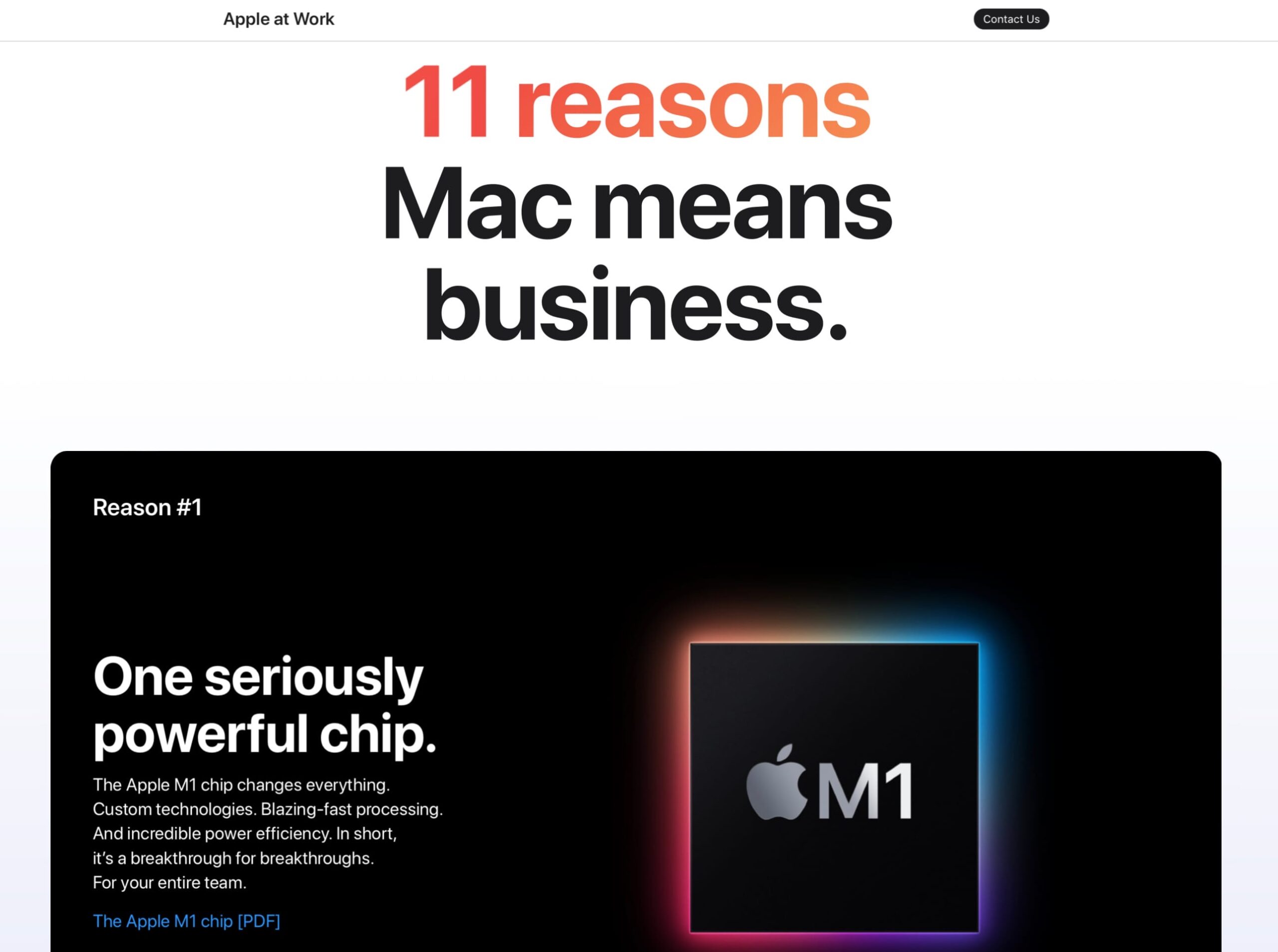 In una sezione del sito statunitense di Apple c’è una nuova pagina intitolata “11 motivi perché Mac significa business”, un gioco di parole di difficile traduzione (“means business” significa “fare sul serio” ma anche “avere le idee chiare”) ma che sostanzialmente potremmo tradurre in “11 motivi perché il Mac è una scelta seria in ambito lavorativo”.