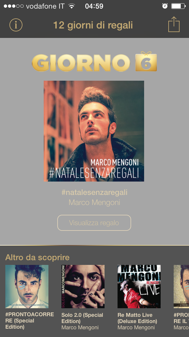 Marco Mengoni ha partecipato anche al Festival di San Remo 2013 guadagnando il primo posto con il brano L’essenziale. Ricordiamo che da diversi anni durante le Festività di Natale Apple regala tramite l’app 12 giorni di regali iTunes musica, app, film, video ed ebook in versione digitale, offrendo agli utenti un contenuto gratuito al giorno dal 26 dicembre fino al 6 gennaio.