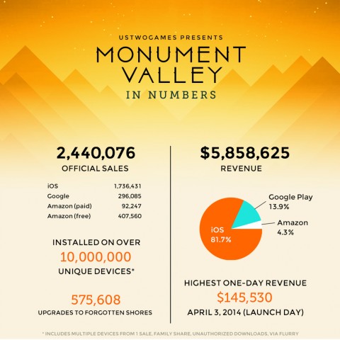 Monument Valley sarebbe stato installato in meno di un anno su circa 10milioni di dispositivi portatili, scaricato 1,7milioni di volte dallo Store di Apple, oltre 296mila volte per dispositivi Android, e 407mila volte da Amazon e ha fatto incassare oltre 5milioni di dollari. Oltre l’80 per cento dei download di Monument Valley arriva dallo Store di Apple. Un dato interessante è quello relativo alle persone che hanno portato a termine l’avventura: circa il 50 per cento di chi ha scaricato l’app ce l’ha fatta a raggiungere l’ultimo livello.