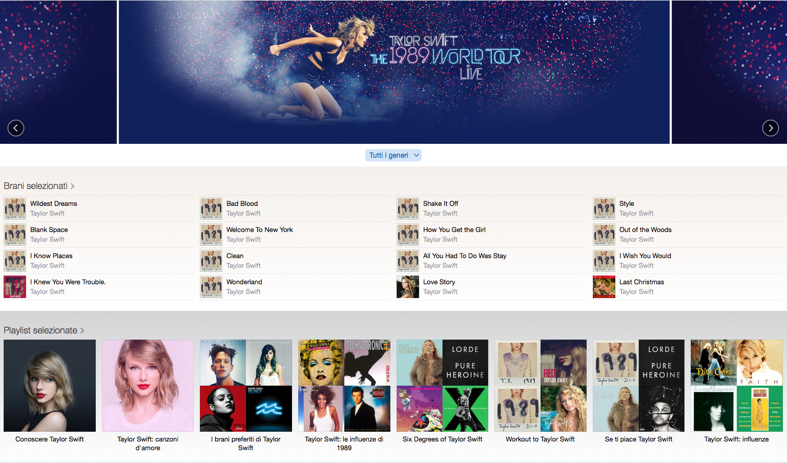 Come si può vedere nell’immagine qui di seguito, la scheda Novità mostra una serie di banner, informazioni e brani totalmente dedicati a 1989 World Tour e a Taylor Swift.