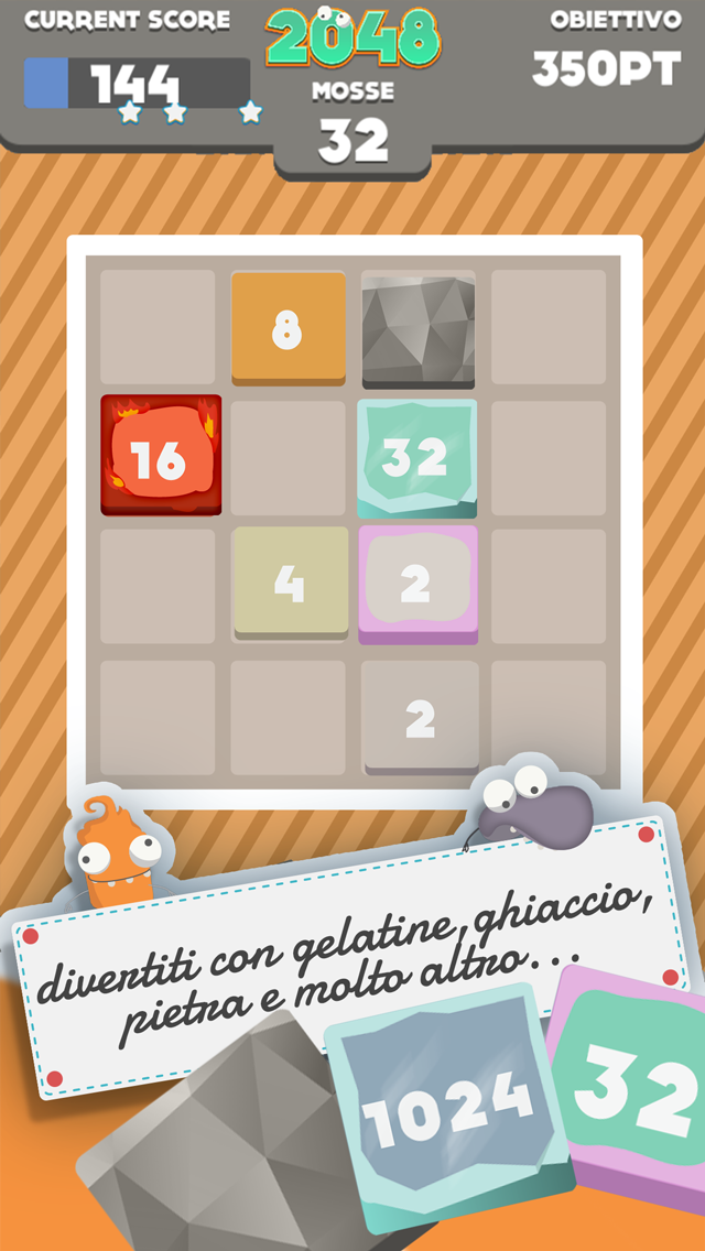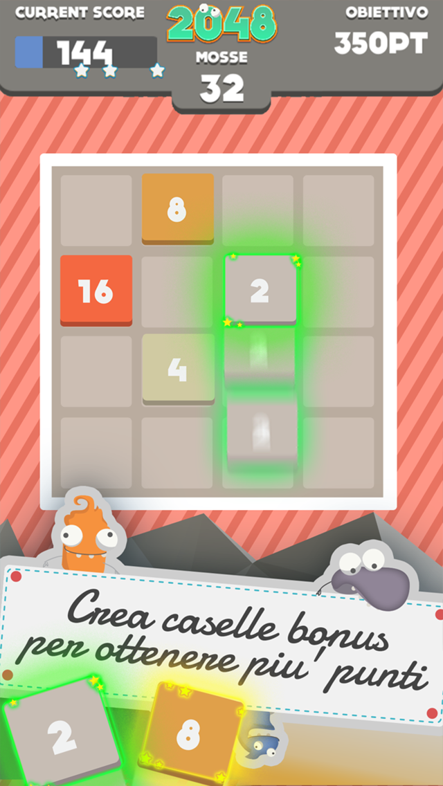 Per vincere bisognerà quindi muovere sempre le caselle nelle quattro direzioni, unendo quelle con lo stesso numero, raddoppiando il punteggio. A rendere avvincente il gioco, oltre ai vari livelli da superare, ci saranno caselle di ghiaccio e gommose, ostacoli di pietra, bombe a tempo, muri invalicabili e molto altro ancora. Il gioco è completamente gratuito e non ci sono pubblicità di alcun genere a disturbare le partite: per vincere più facilmente o proseguire nel gioco più velocemente è possibile acquistare potenziamenti, vite e aiuti tramite in-app purchase, come il booster “spazzino” o il moltiplicatore.