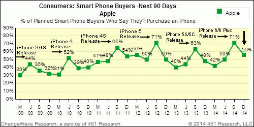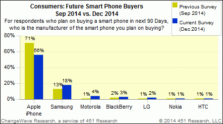 Le domande miravano a indagare le intenzioni di acquisto delle persone che vorrebbero acquistare uno smartphone e Apple continua a essere la scelta preferita per chi vorrebbe acquistare un telefono nei prossimi 90 giorni: il 56% degli intervistati ha infatti dichiarato che ha intenzione di acquistare un iPhone. Si tratta di una percentuale in calo rispetto al precedente sondaggio dello scorso settembre 2014, quando il desiderio di acquistare un iPhone si attestava al 71 per cento degli intervistati, ma secondo 451 Research rappresenta il livello di richieste di iPhone più elevato di sempre a tre mesi dal rilascio di un nuovo modello.