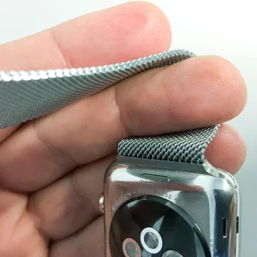 In questi giorni abbiamo usato il cinturino in maglia milanese di Hoco come nostro unico bracciale per Apple Watch e dobbiamo dire di essere molto soddisfatti. L’accessorio è elegante, quasi completamente non distinguibile dal modello di Apple, in più è leggero e una volta allacciato, il magnete tiene molto bene la presa. Anche se si dovesse stringere troppo la linguetta, il bracciale si allenterà leggermente quando fletterete il polso, ma non ci sarà alcun pericolo di veder scivolare via l’aggancio.