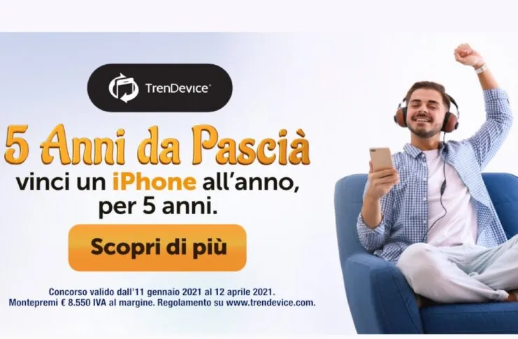 Ogni vincitore avrà N.1 buono noleggio di 5 anni di un iPhone Ricondizionato TrenDevice a sua scelta, di Grado A con capacità di archiviazione di base e colore in base alla disponibilità. Allo scadere dei 12 mesi, e per una durata di 5 anni, il vincitore sarà ricontattato per la sostituzione del dispositivo con un altro modello di iPhone TrenDevice a sua scelta, previa riconsegna del precedente modello. In questa pagina trovate maggiori dettagli del concorso e a questo link potete scaricare il regolamento completo del concorso “5 anni da Pascià: vinci un iPhone all’anno, per 5 anni.”