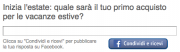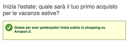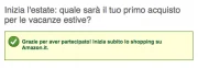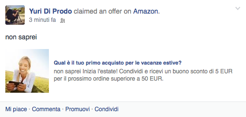 Per partecipare alla promozione è necessario innanzitutto collegare l’account Amazon al proprio profilo Facebook seguendo le istruzioni riportate a questo indirizzo. Successivamente, cliccate qui per accedere alla pagina della promozione, rispondete alla domanda “Inizia l’estate: quale sarà il tuo primo acquisto per le vacanze estive?” anche con un semplice “non saprei” nel caso in cui non siete a conoscenza del vostro prossimo acquisto e cliccate sul pulsante Condividi e ricevi: un messaggio sulla pagina insieme ad una mail vi confermeranno l’avvenuta ricezione del coupon.