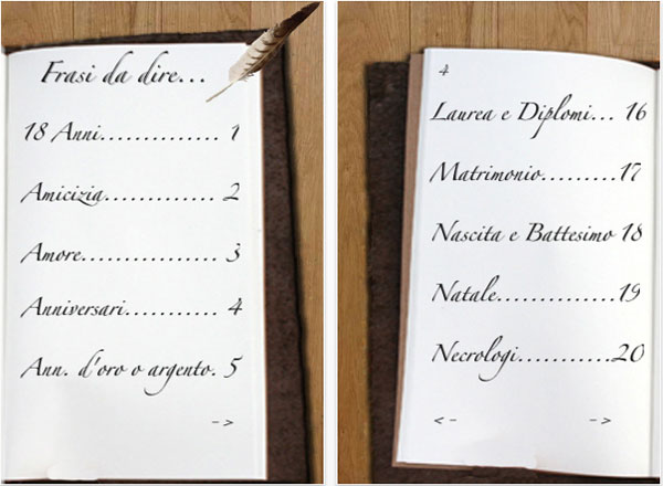Il database infatti è stato suddiviso in diverse categorie: 18 Anni, Amicizia, Amore, Anniversari, Anniversario Oro e Argento, Annuncio funebre, Capodanno, Compleanno, Condoglianze, Cresima, Festa della mamma, Festa della donna, Festa del papà , Fidanzamenti, Inviti, Laurea e Diplomi, Matrimonio, Nascita e Battesimo, Natale, Necrologi, Onomastico, Pasqua, Pensione, Prima Comunione, Ringraziamenti, San Valentino, Scuse.