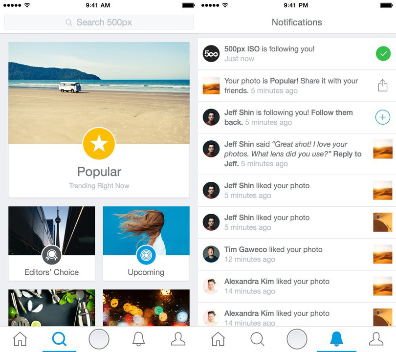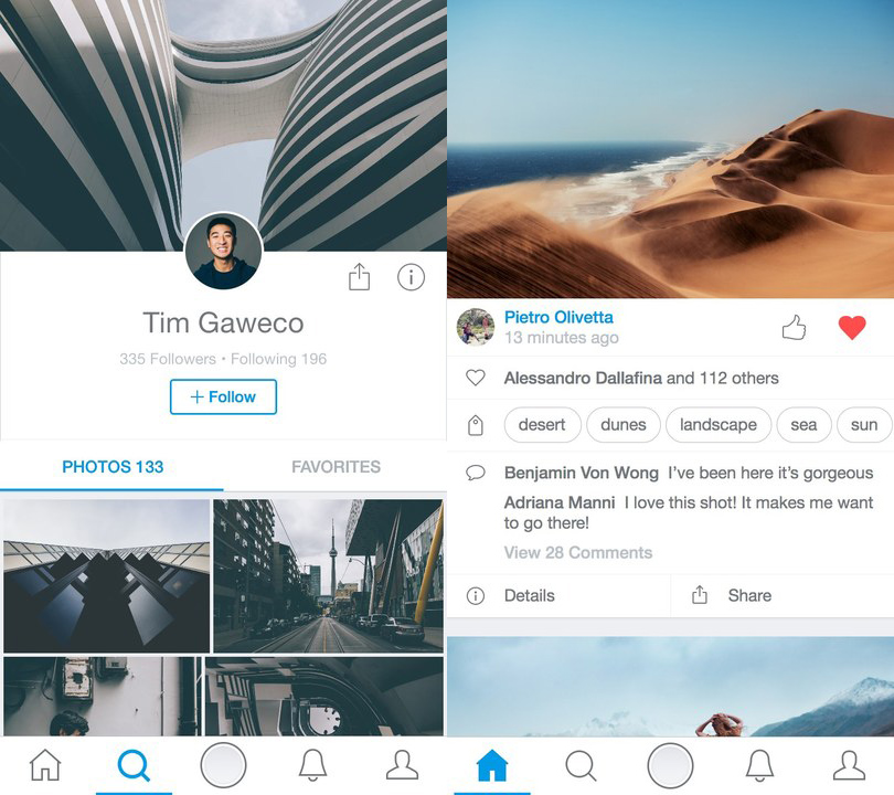 Con la 4.0 cambia tutto, a partire dall’aspetto e dall’interfaccia della app, per arrivare ai dettagli più nascosti. 500px ora è molto più leggere a minimalista, e dà spazio e rilevanza alle immagini più che mai. Cambia la home screen, ora incentrata sul feed e le immagini delle persone che seguite, miste ad alcune suggerite da 500px stessa, per scoprire nuovi talenti.