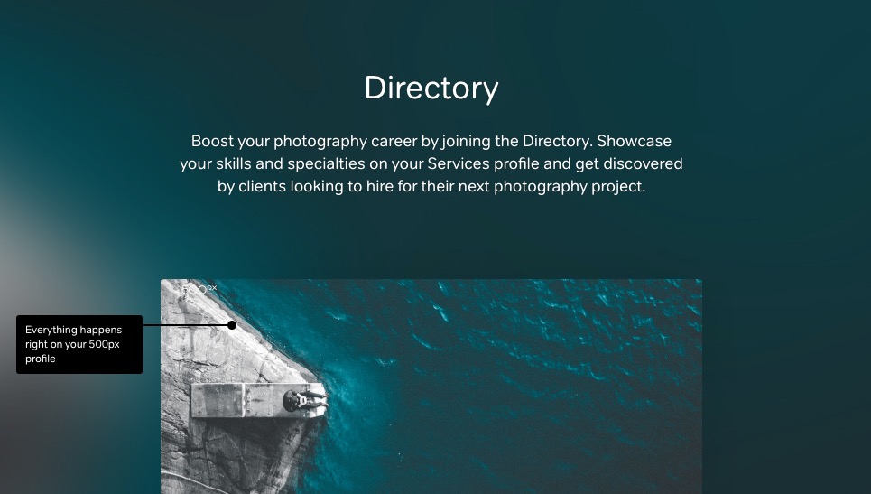 I fotografi che utilizzeranno Directory saranno in grado di impostare il loro profilo utente, fissare i prezzi per il loro lavoro e comunicare direttamente con i clienti. 500px sostiene che userà Directory per individuare fotografi per “grandi clienti Corporate per collaborazioni fotografiche on demand” a livello globale, e che i clienti potranno anche utilizzare il servizio per individuare i fotografi adatti per i loro progetti.