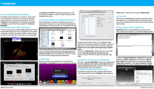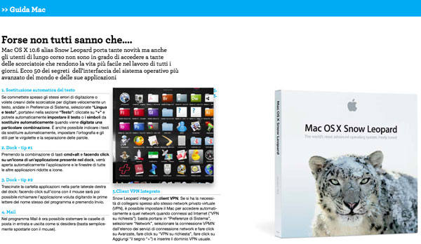 Intitolato “Forse non tutti sanno che” l’articolo offre 50 trucchi e consigli, alcuni dei quali derivanti anche da precedenti versioni, che permettono di personalizzare l’interfaccia e raggiungere velocemente le funzioni che semplificano e migliorano il lavoro e il tempo libero con il nostro Mac. Di rapida lettura i consigli e i trucchi sono in grado di svelare scorciatoie e nuove funzioni di Snow Leopard spesso ignorate anche dagli esperti di Mac. La lettura di questo articolo così come del resto della guida Juice è caldamente raccomandata a tutti gli appassionati della Mela italiani.