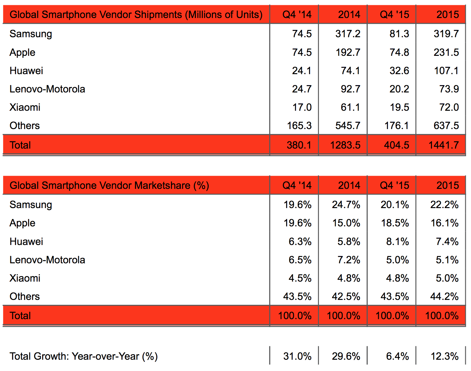 Ora che tutte le cifre ufficiali sono note, la società di analisi di mercato è in grado di assegnare ad Apple il 16,1% del mercato globale degli smartphone, contro il 22,2% di Samsung. Tra Cupertino e la principale concorrente ci sono 6,1 punti percentuali, meno dello scorso anno quando erano 9,7. Apple però ha contato soprattutto sul trionfo ottenuto nei primi mesi dell’anno perché nell’ultimo trimestre, pur avendo conquistato una leggera crescita, in fatto di unità vendute (74,8 milioni contro 74,4 milioni) ha perso mercato (18,1% contro 19,6%) mentre Samsung ha guadagnato (20,1% contro 19,6%).