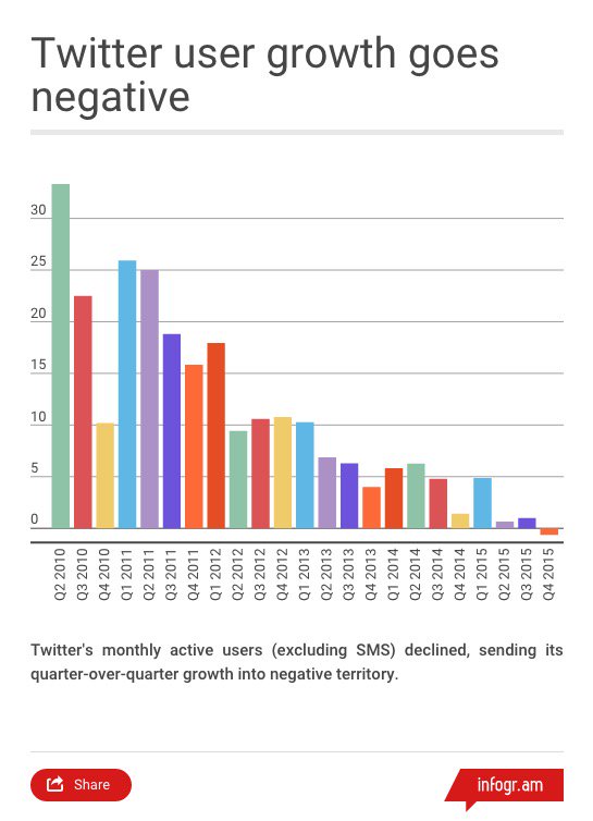 Twitter cresce a livello finanziario ma la sua base utente si contrae. La società ha annunciato i guadagni fiscali del quarto trimestre 2015, riportando un fatturato di 710 milioni di dollari e una perdita netta di 90 milioni. Rispetto allo stesso trimestre dello scorso anno, il fatturato è cresciuto del 90 per cento, mentre le perdite nette si sono ridotte del 27 per cento, grazie a una base di inserzionisti di 130.000 soggetti, in crescita del 90 per cento rispetto all’anno precedente.