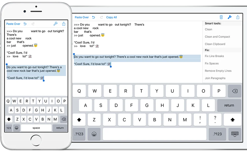 L’applicazione è ottimizzata per iPad Pro, consentendo sia la visione Slide Over, sia quella Split View, per affiancare finestre e massimizzare la produttività . Oltre alle funzioni base sopra elencate, l’app permette anche di aumentare e diminuire il rientro del testo, effettuare codifiche ROT13, convertire, HTML in testo normale, convertire emoji e simboli in descrizioni testuali, e altro ancora.