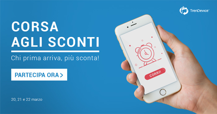 Su TrenDevice il 20, 21 e 22 Marzo, ci saranno ogni giorno 3 codici sconto da 100€, 5 da 50€ e 20 da 30€ validi per l’acquisto di un qualsiasi iPhone o iPad Ricondizionato. Come potete ottenere questi sconti? A partire da oggi 20 Marzo, e per tutti 3 i giorni della promozione, i primi tre di voi che si iscriveranno a questa pagina, riceveranno il codice sconto da 100€, dal 4° all’8° iscritto verrà riservato il codice da 50€, dal 9° al 28° iscritto è previsto il codice da 30€.