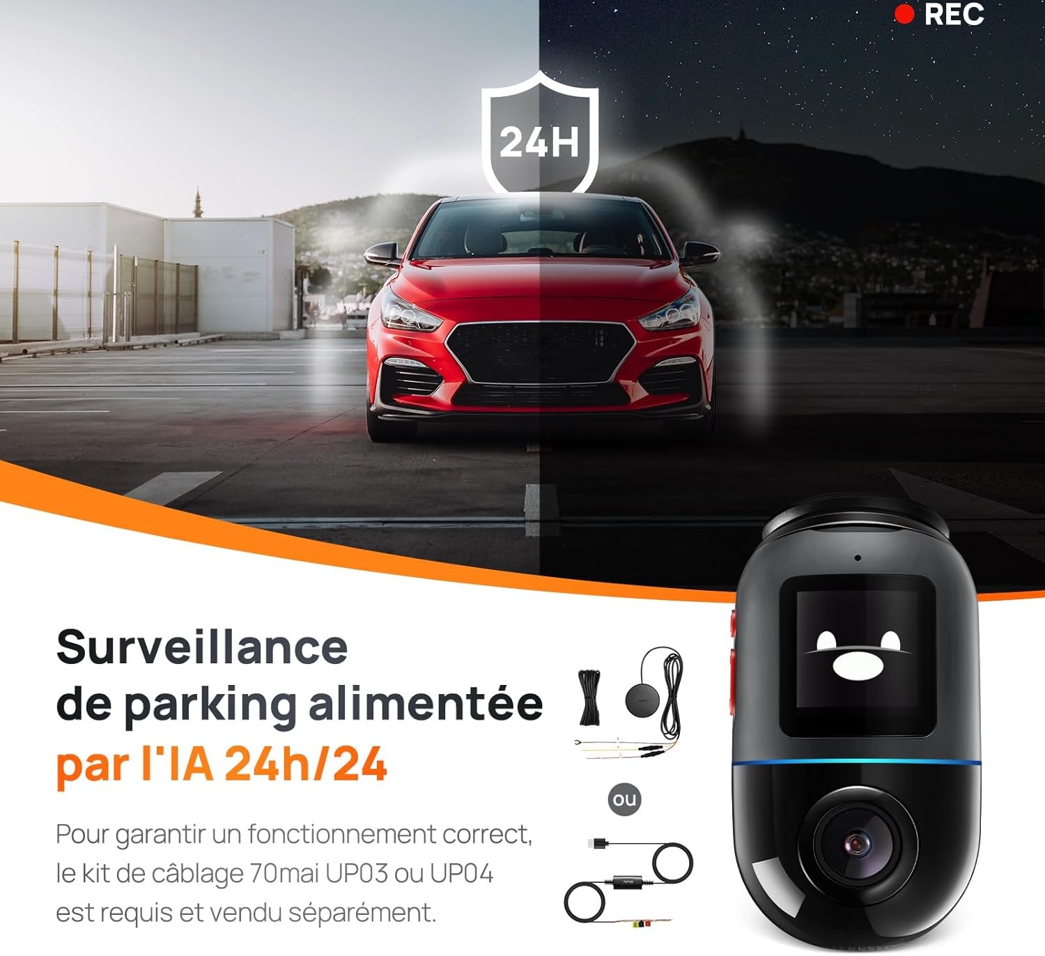 La 70mai Dash Cam Omni offre un monitoraggio 24 ore su 24, anche quando l’auto è parcheggiata, grazie al kit di cablaggio 70mai UP03. L’Intelligenza Artificiale rileva attività sospette e traccia i movimenti, garantendo una copertura costante dell’auto.