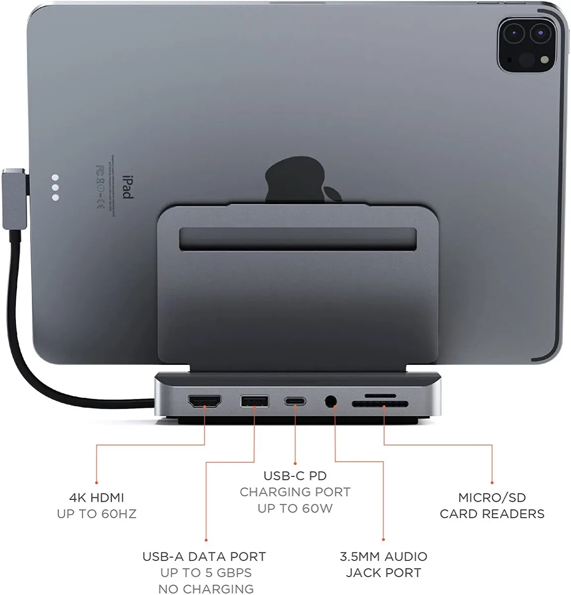 Come ogni hub, anche quello di Satechi presenta porte extra per espandere la funzionalità dell’iPad. In particolare, la periferica include una porta HDMI in grado di trasmettere 4K con una frequenza di aggiornamento fino a 60 Hz, una porta dati USB-A, una porta PD USB-C con un massimo di 60 W per la carica, un jack per cuffie e slot per SD e microSD.