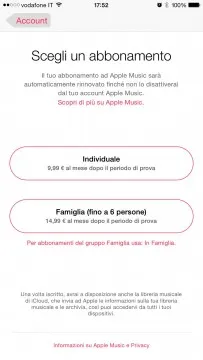 Ricordiamo che Apple Music per i primi tre mesi è completamente gratuito. Dopo i primi tre mesi costa 9,99 euro per un singolo utente o 14,99 euro al mese fino a sei utenti dello stesso nucleo famigliare.