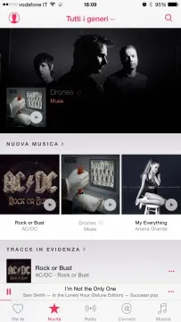 Novità è forse la più complessa e strutturata delle sezioni. Si tratta di una selezione di brani e album attuata da Apple sulla base di un foltissimo team che aiuterà a scoprire il meglio della più recente produzione musicale. Qui troveremo playlist tematiche (ad esempio oggi vediamo Grea Girls in Music in Italy Playlist o Great Being Outdoor Playlist), i brani top, una lista di classifiche (video e album) e compilation di brani dedicati ad attività come lo sport, relax, atmosfera romantica, correre, cucinare, fare festa, fine di un amore e così via…. Ci sono anche liste di brani create da esperti musicali di Shazzam, Rolling Stone, Q Magazine, Mojo Magazine. Non manca “fari su“; in quest momento abbiamo Animali da Palco con Fabi Silvestri Gazzè, Jovanotti, Pino Daniele, Biagio Antonacci e molti altri, di fatto una serie di album live