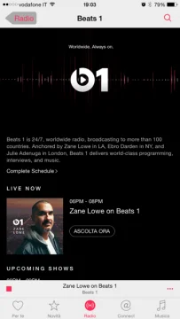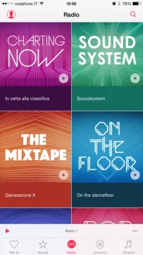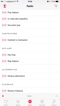 Infine abbiamo Radio che è, appunto, una lista di radio in streaming diverse per tematiche; pop, all city, pop italiano, in vetta alla classifica, Hip Hop, Classica e tantissimi altri. Una particolarità è che potremo ascoltare la musica così come ci viene proposta, oppure, ma anche “skippare” i singoli brani senza limiti