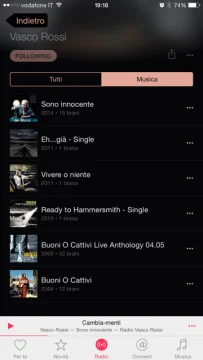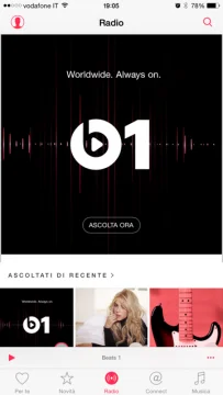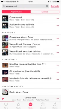 Come abbiamo scritto altrove, Apple Music ha una interfaccia abbastanza complessa e non semplicissima da dominare. In linea generale il concetto cui dovremo abituarci è che la musica in streaming si distingue da quella sul nostro dispositivo, usando la selezione alla base dell’applicazione “Musica” e che solo l’icona alla estrema destra è quella che ci permette di accedere alla musica che risiede sul nostro dispositivo o che avremo selezionato, scegliendola da Apple Music. Tutte le altre icone danno accesso al sistema di musica in streaming, sia esso “on demand” (brani che potremo cercare e ascoltare a nostro piacimento ed eventualmente aggiungere a Musica e anche scaricare per l’ascolto offe line) o alle Radio (selezioni di brani attuate da Apple, oppure radio Beat 1 o BBC World Service).