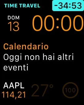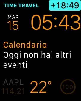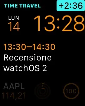 Rinnovata è poi la modalità Time Travel: attualmente con watchOS 1 è possibile spostarsi avanti e indietro quando si utilizzano i quadranti che mostrano il sistema solare. Con watchOS 2 questa funzione viene potenziata a tutti i quadranti che dispongono di Complicazioni (anche di terze parti): in pratica ruotando la Corona Digitale ci si potrà muovere all’interno delle precedenti e successive 48 ore (nella beta si arriva a 35 ore) per dare ad esempio uno sguardo a Promemoria ed eventi in Calendario programmati o precedentemente completati.