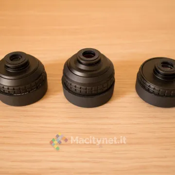 La lente Fisheye è invece convessa, senza alcun paraluce, e ad un primo sguardo impressiona per la qualità costruttiva del gruppo ottico, ben 6 componenti stando a quanto si evince dalla scheda tecnica. Il teleobiettivo invece, dal canto suo, ha un paraluce circolare classico che elimina le infiltrazioni di luce.