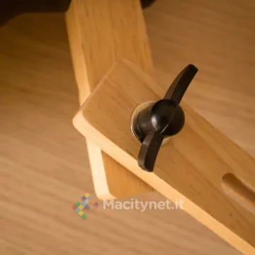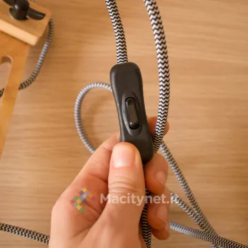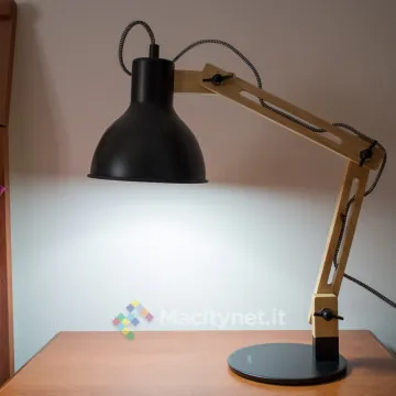 Completata la fase di montaggio, è possibile collegare la lampada alla presa di corrente attraverso la spina (italiana) e gestire accensione e spegnimento attraverso l’interruttore incorporato lungo il cavo. Di base il cavo, che passa attraverso ciascuna componente del braccio in legno, è allentato quanto basta per permettere qualsiasi tipo di orientamento della lampada, potendola così orientare e ripiegare facilmente. Con un po’ di pazienza, è possibile tenderlo per farlo aderire quanto più possibile alla struttura, in questo modo risulterà visivamente più ordinata ma meno agile nei movimenti, anche se le torsioni e flessioni più comuni del braccio restano ancora del tutto agibili.