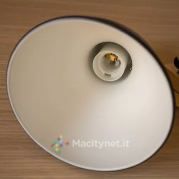 La parte terminale comprende l’ultimo componente in legno che si avvita al braccio ed il portalampada già infilato all’interno del paraluce (diametro 15 centimetri come la base), nera come la base all’esterno e bianca all’interno, per riflettere meglio la luce della lampadina (non inclusa).