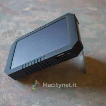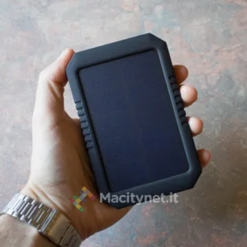 Il punto di forza è certamente nel pannello solare incorporato sulla superficie frontale, che garantisce la ricarica della batteria integrata semplicemente appoggiandola su un prato al sole. Grazie al gancio (sul retro) estraibile si può eventualmente fissare anche allo zaino o alla cintura dei pantaloni: è realizzato in metallo ed è molto rigido nei movimenti, di fatto mantiene la posizione assegnata, quindi si può eventualmente trasformare anche in un pratico stand per mantenere la batteria inclinata in direzione dei raggi del sole.
