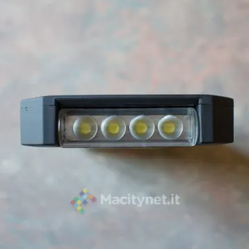 Sul retro c’è anche un pulsante che attiva (doppio click) i 4 LED frontali. La batteria è infatti dotata di una torcia abbastanza potente da illuminare una porzione di spazio di circa 1 x 1 metro ad una distanza di 1-2 metri al massimo, quindi è l’ideale in campeggio per rovistare all’interno di uno zaino o illuminare una tenda. In quest’ultimo caso risulta particolarmente comoda la possibilità di inclinare il fascio luminoso di 45 o 90 gradi semplicemente ruotando tutto il “cilindro” che accoglie i 4 LED, moltiplicando così le possibilità di utilizzo.