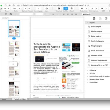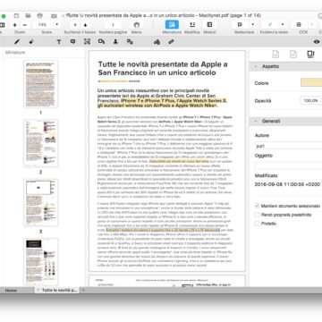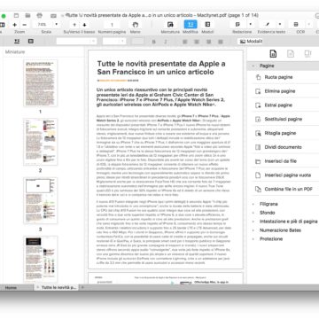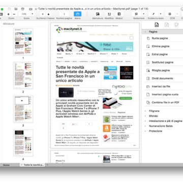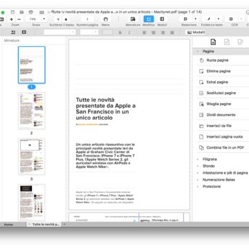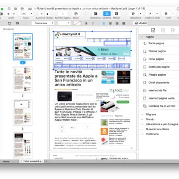 Quando si ha a che fare con PDF complessi (per un esempio pratico abbiamo esportato un nostro articolo direttamente dal sito in PDF), è possibile anche agire direttamente sul file stesso: il software infatti riconosce i singoli elementi e permette di spostarli, ridimensionarli o cancellarli del tutto. Riconosce anche il testo, permettendo di aggiungere una frase o, come nell’esempio che riportiamo di seguito, anche di modificare completamente la disposizione del testo, rimuovendo banner per riempire la pagina soltanto con le informazioni che ci interessano.